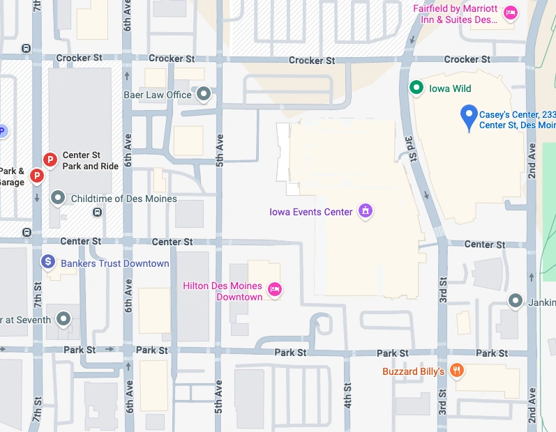 Parking at Casey’s Center is close and convenient with the Iowa Events Center surface parking lot, which has easy access to I-235 and other major routes after the event. Parking costs $8 for cars and $32 for RVs and Buses per day, and the lot can be found north of the Iowa Events Center with entrances off of the following streets: